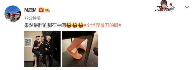 5月26日,鄧超在微博曬與陳赫、鹿晗合照,并調侃陳赫的腳“全世界最丑”;隨后,陳赫發文反駁:“果然好看的..還是在中間”;鹿晗則稱:“果然最胖的腳在中間”。三人互懟,畫風十分歡樂。
