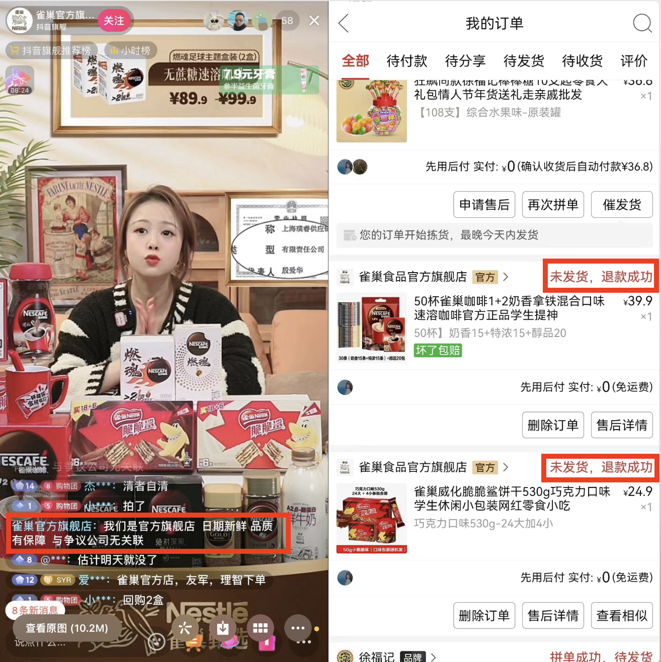 這也直接導致了后續其他幾十家品牌店的“炸店”行為。界面新聞看到,在雀巢等官方旗艦店的店鋪直播中,店鋪方曾多次作出解釋:“我們是官方旗艦店,與爭議公司無關聯?!?/p>