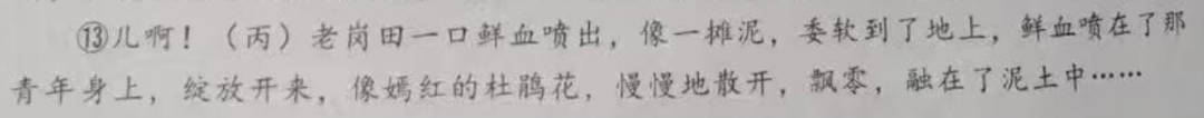 作者這么寫的:“一口鮮血噴出,像一灘泥,委軟到了地上,鮮血噴在了那青年身上,像嫣紅的杜鵑花......”