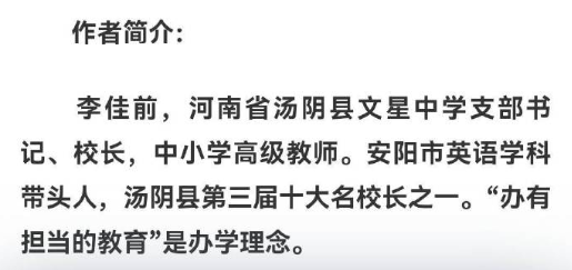 網(wǎng)友們扒拉了一下,發(fā)現(xiàn)該小說的作者名叫“李佳前”,是河南省湯陰縣文星中學(xué)支部書記,被評選過“湯陰縣第三屆十大名校長之一”。說實話,這個名頭有點太低了。如果不是這篇小說被選入成都新都區(qū)初三年級語文測試,可能沒幾個人會認識他。在一個常規(guī)縣,都不一定能湊出十所中學(xué),而李佳前被評為湯陰縣十大名校長,這完全就是一個虛假的榮譽。